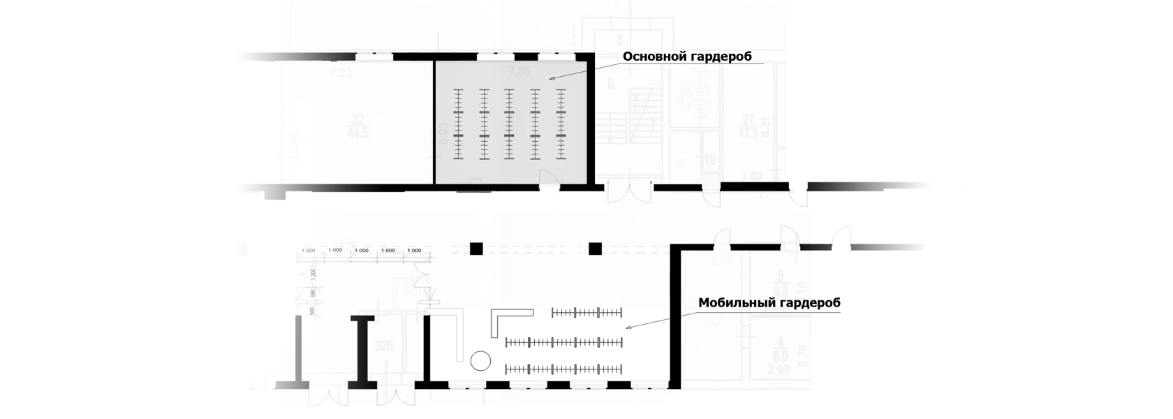 "Намеченных контурах", предполагалось в помещении слева от центрального входа, однако, в соответствии с изменением места расположения поста охраны и масштабным включением в холл территории входных турникетов, одновременно с уточнением места развертывания мобильного гардероба, основной гардероб актуально располагать в помещении справа от центрального входа.