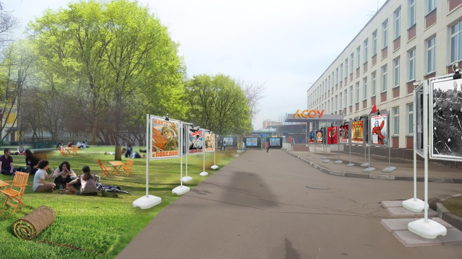 Расположение флагштоков со смещением от оси здания по пропорции золотого сечения в центральное место внутреннего сквера, не только позволяет реализовать, но и композиционно достраивает проекты создания