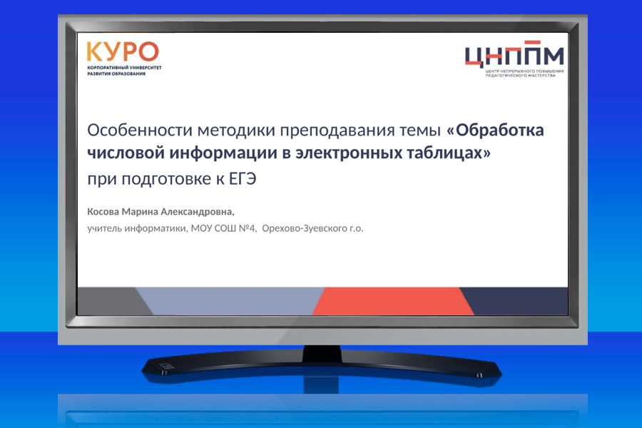 - Косова М.А., учитель информатики МОУ СОШ №4, городской округ Орехово-Зуево: «Особенности методики преподавания темы «Обработка числовой информации в электронных таблицах» при подготовке к ЕГЭ».