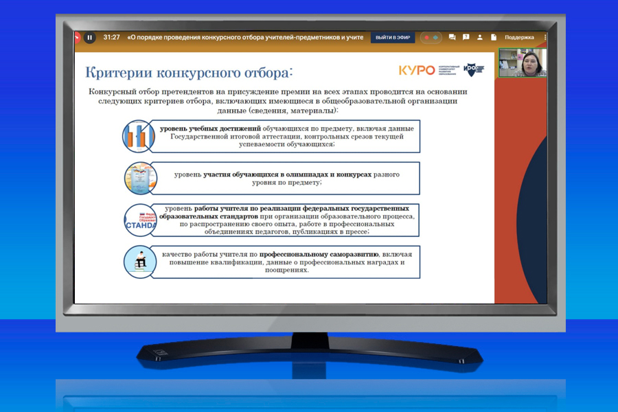 14 мая состоялся вебинар «О порядке проведения конкурсного отбора учителей-предметников и учителей начальных классов на присуждение премии Губернатора Московской области «Лучший учитель-предметник и лучший учитель начальных классов» в 2025 году.